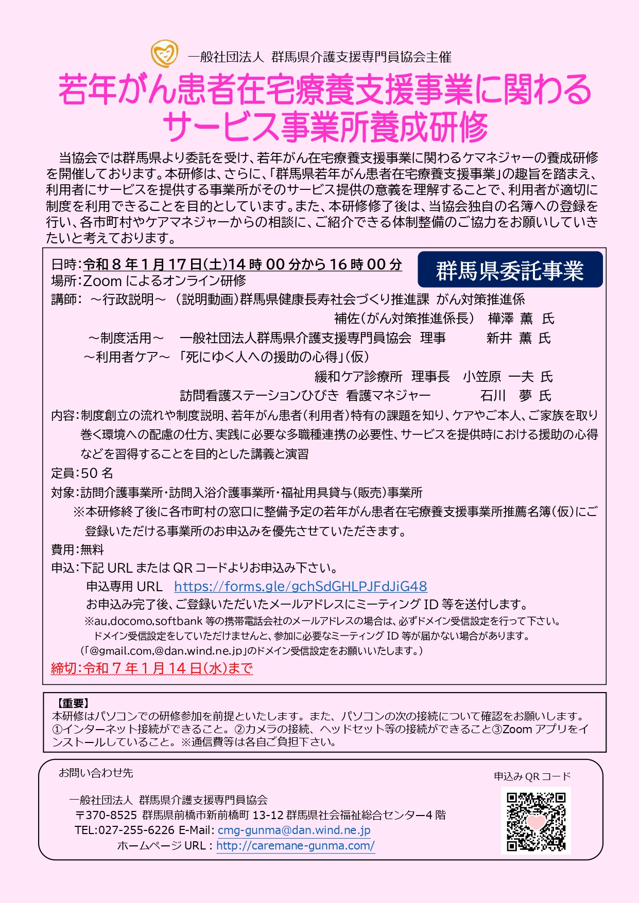 本研修は、さらに、「群馬県若年がん患者在宅療養支援事業」の趣旨を踏まえ、利用者にサービスを提供する事業所がそのサービス提供の意義を理解することで、利用者が適切に制度を利用できることを目的としています 。